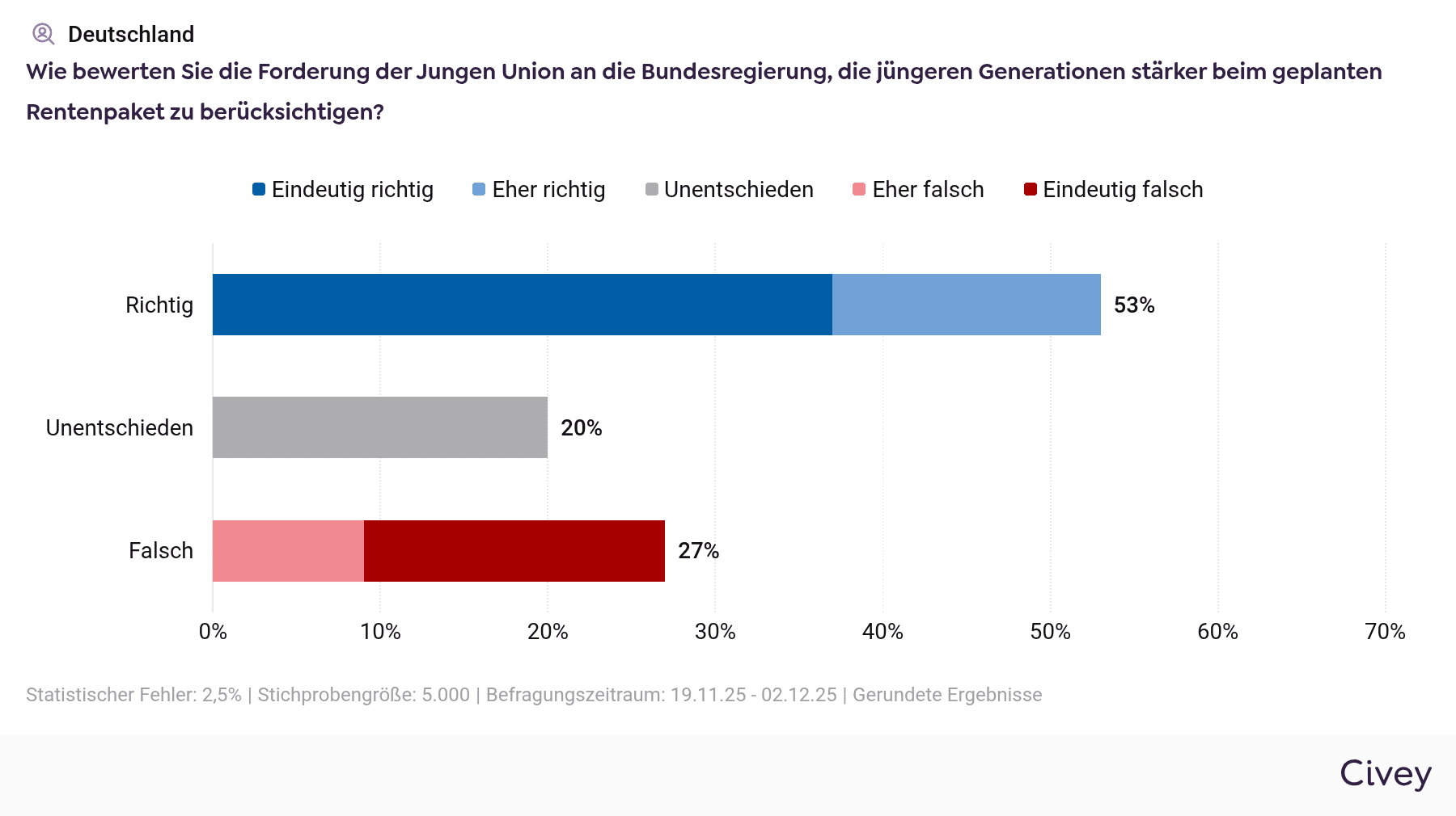 Diesen Raum besetzt derzeit die Junge Union. Ihre Forderung, die jüngere Generation im Rentenpaket stärker zu berücksichtigen, findet mehrheitlich Zustimmung: Mehr als jeder Zweite hält dieses Anliegen für richtig. Es geht also nicht um einen Konflikt der Generationen, sondern um eine balancierte Lastenverteilung – um Fairness zwischen Lebensphasen, nicht um Konkurrenz zwischen Altersgruppen.