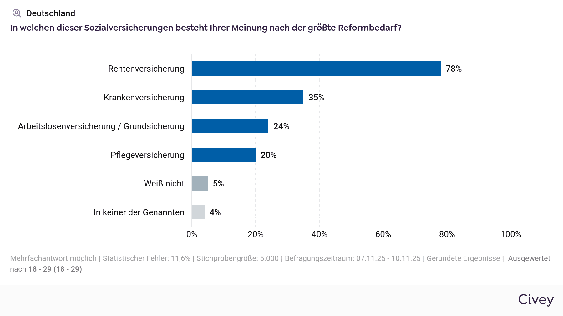 Besonders häufig nennen die Befragten die Rentenversicherung als drängendsten Reformbereich, gerade die Jüngeren. Hier geht es nicht um Detailkorrekturen, wie technische Begriffe wie „Haltelinie” oder „Nachhaltigkeitsfaktor” vermuten lassen. Sondern um die Zukunftsfähigkeit eines zentralen Solidarversprechens.